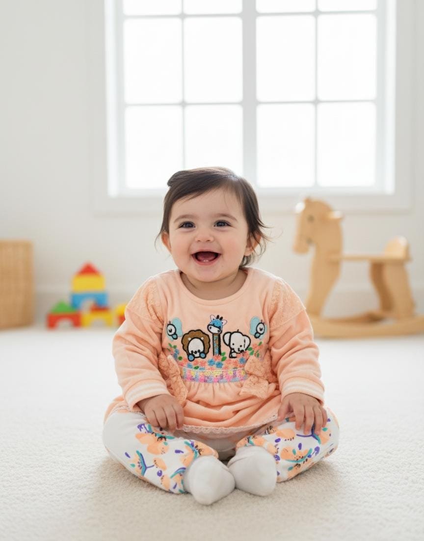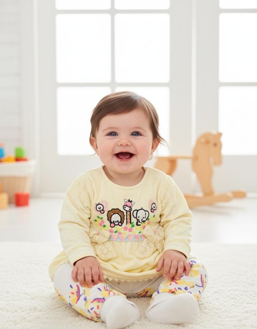 Adorable baby girl velvet dress featuring cute animal embroidery on the top with soft floral printed pajama. Cozy, stylish, and perfect for everyday wear.